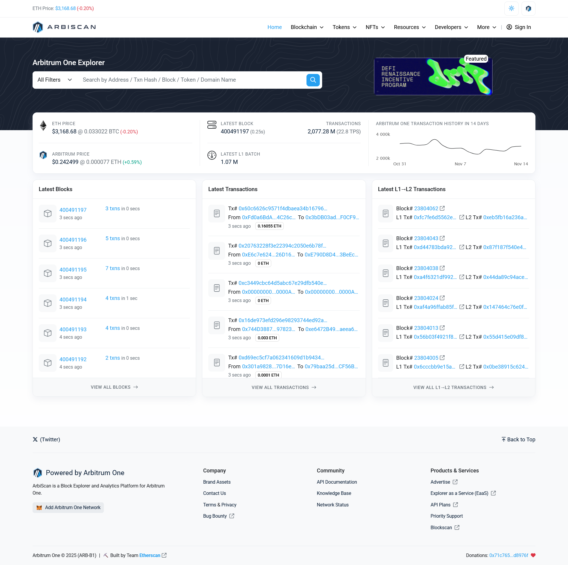 Arbiscan is a blockchain explorer for the Arbitrum network. Much like Etherscan is for the Ethereum blockchain, Arbiscan serves as the go-to platform for exploring transactions, blocks, smart contracts, and token transfers on the Arbitrum network. It allows users to monitor all the activities happening on Arbitrum, providing full transparency and making it easier to interact with the network.